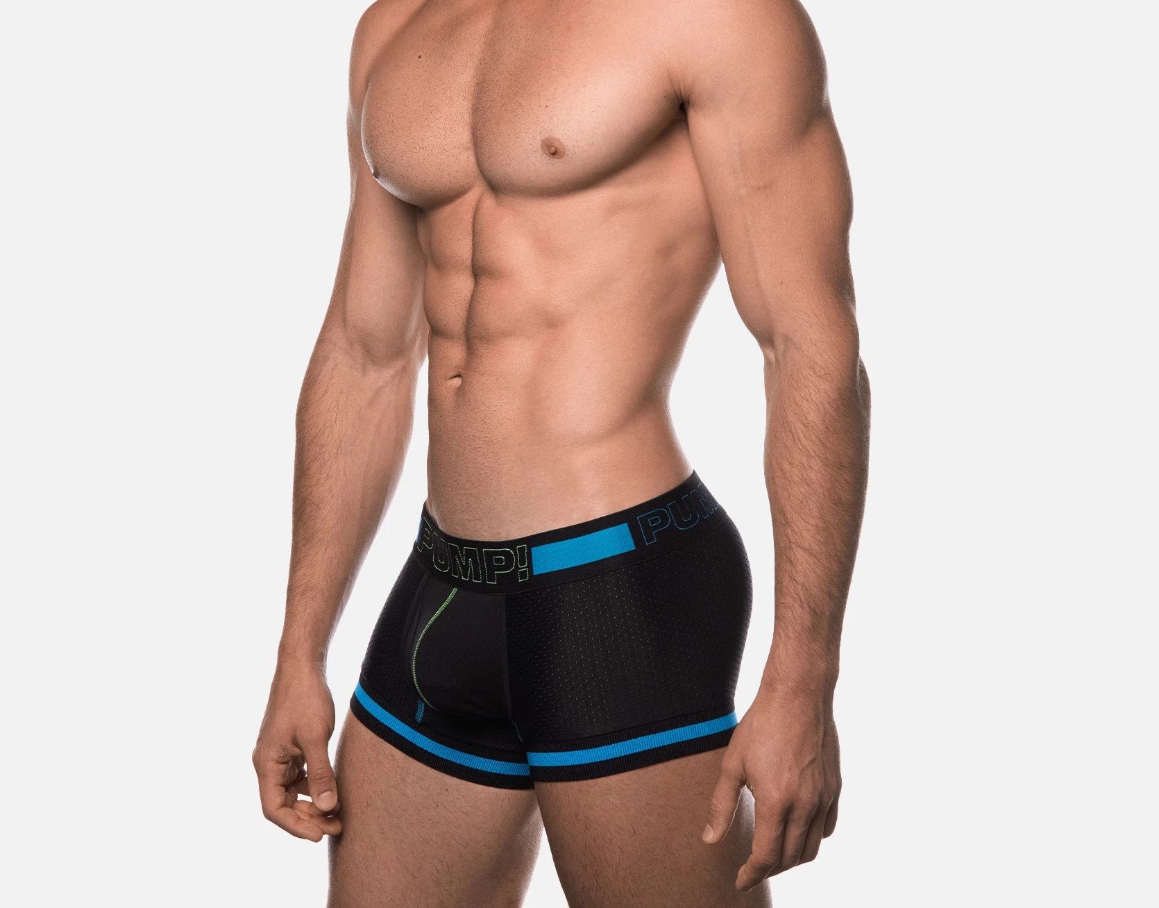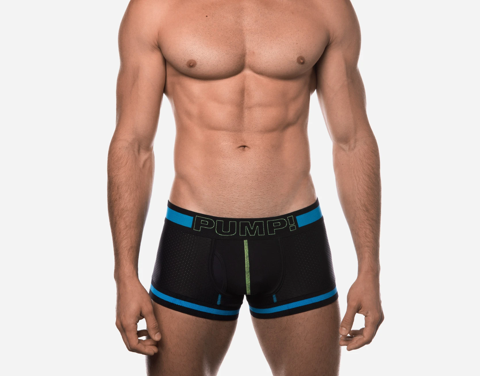 In order to be with you at all times, PUMP! has created the Touchdown Sonic Boxer with a black mesh body design, black cotton cup with neon green stitching complemented by a black, blue and neon green 45 mm elastic waistband. This is an all-day, all-night boxer that never gives in even in enemy territory.