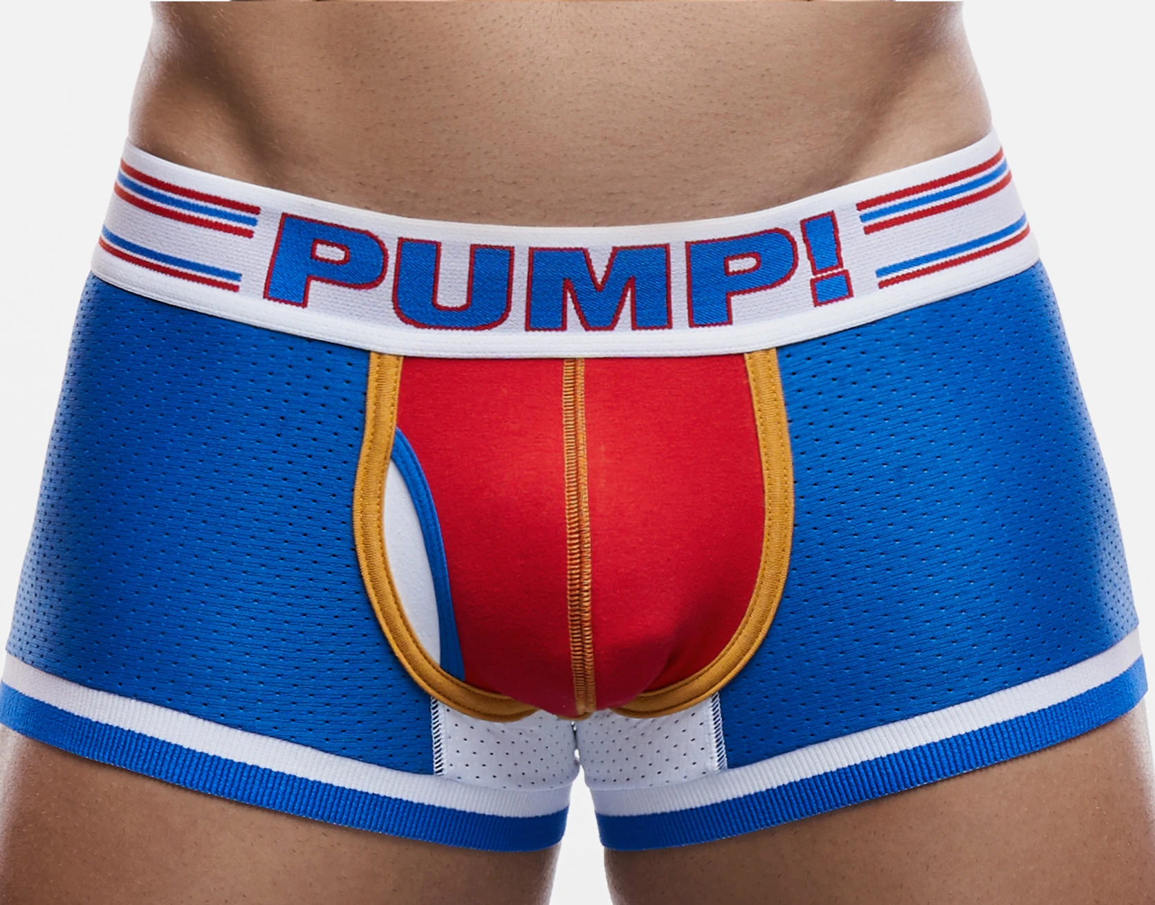 Steer everyone’s attention your way with PUMP!’s Velocity Touchdown Boxer. This boxer features a Redhot mesh cup lined with white cotton offering space and security for your goods. The electric blue mesh body and a wide, white waistband accentuated with a blue and red racing-stripe-inspired design gives you the ultimate streamlined look while providing a comfortable and aerodynamic fit.